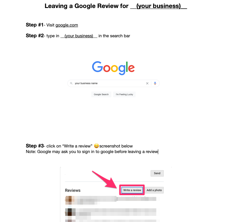 This can involve a direct link or creating a small printout with 3-step instructions on how to leave you a review (like this quick one I made below). This one works great….